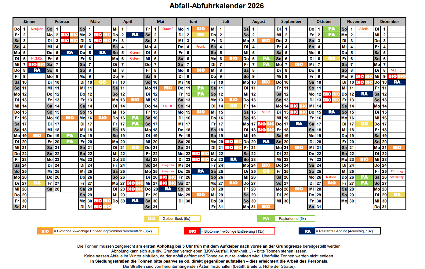 Bitte beachten Sie auch, dass die Mülltonnen zeitgerecht (am Vortag oder zeitig in der Früh!) und mit dem Aufkleber nach vorne zur Abfuhr bereitgestellt werden. Es kann vorkommen, dass die Tour einmal nicht wie üblich gefahren wird und eventuell die Müllabfuhr früher als gewohnt kommt. Der Abholtermin kann sich auch aus personellen